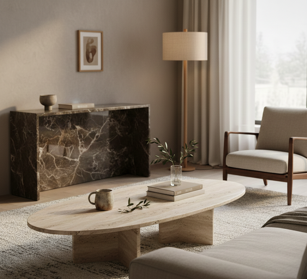 - Orta Sehpa: Traverten günlük kullanım için idealdir; mermer büyük salonlarda odak yaratır.