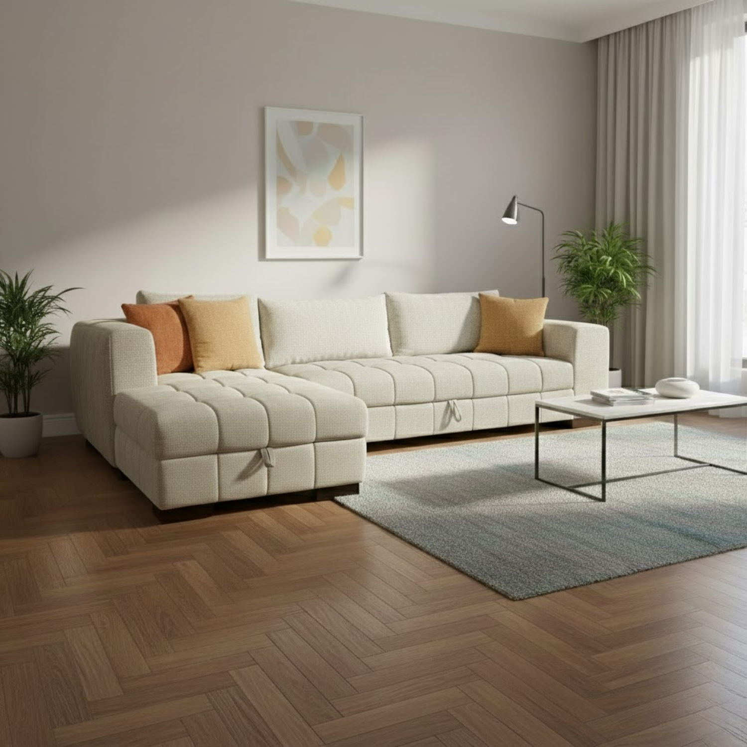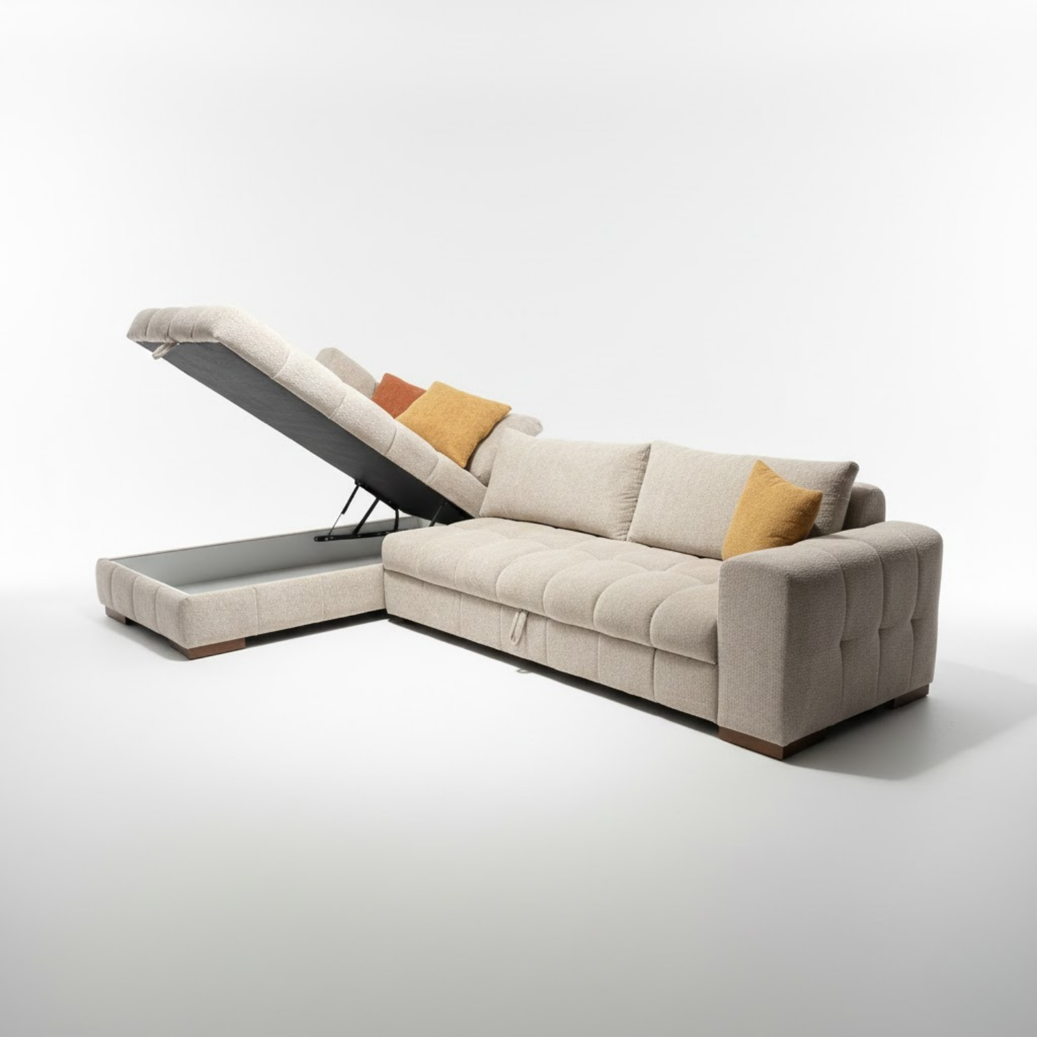 Fonksiyonelliği estetikle buluşturan Aden Yataklı Köşe Koltuk, geniş depolama alanı sayesinde yorgan, battaniye ve günlük eşyalar için ideal bir çözüm sunar.