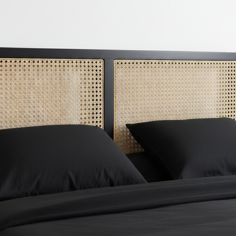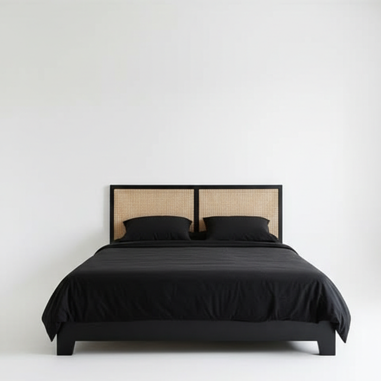 Blaka, geleneksel el işçiliği hissiyatını modern ve maskülen bir silüetle yeniden yorumluyor. Siyahın asaletini doğal hasır örgü (hazeran) detaylarıyla yumuşatan bu özel tasarım, yatak odanızda zamansız bir odak noktası yaratır.